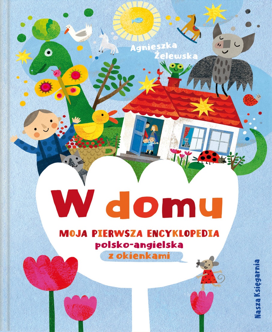 „W domu. Moja pierwsza encyklopedia polsko-angielska z okienkami” to książka edukacyjna, dzięki której najmłodsi poznają świat i uczą się angielskich słówek. Pojawia się tu słownictwo związane z domem i rodziną: nazwy pomieszczeń i sprzętów, zabawek i ubrań, członków rodziny, części ciała i wielu drobiazgów, w sumie ponad 200 słówek. Na każdej rozkładówce można odszukać i otworzyć okienka (w całej książce jest ich ponad 50), co pozwala odkrywać kolejne szczegóły i słowa.
